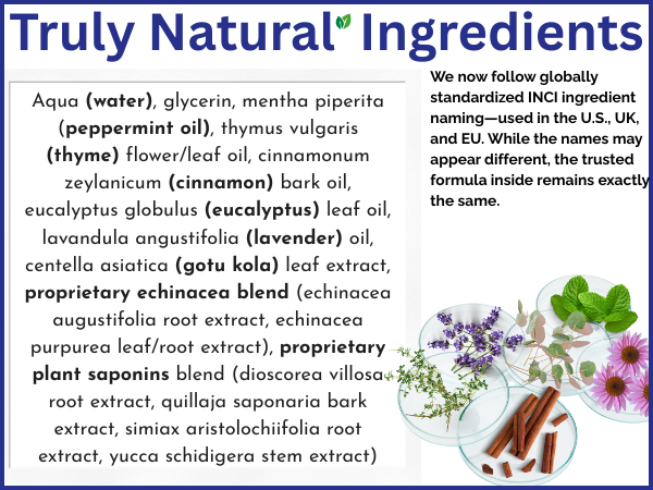 Aqua (water), glycerin, mentha piperita (peppermint oil), thymus vulgaris (thyme) flower/leaf oil, cinnamonum zeylanicum (cinnamon) bark oil, eucalyptus globulus (eucalyptus) leaf oil, lavandula angustifolia (lavender) oil, centella asiatica (gotu kola) leaf extract, proprietary echinacea blend (echinacea augustifolia root extract, echinacea purpurea leaf/root extract), proprietary plant saponins blend (dioscorea villosa root extract, quillaja saponaria bark extract, simiax aristolochiifolia root extract, yucca schidigera stem extract)