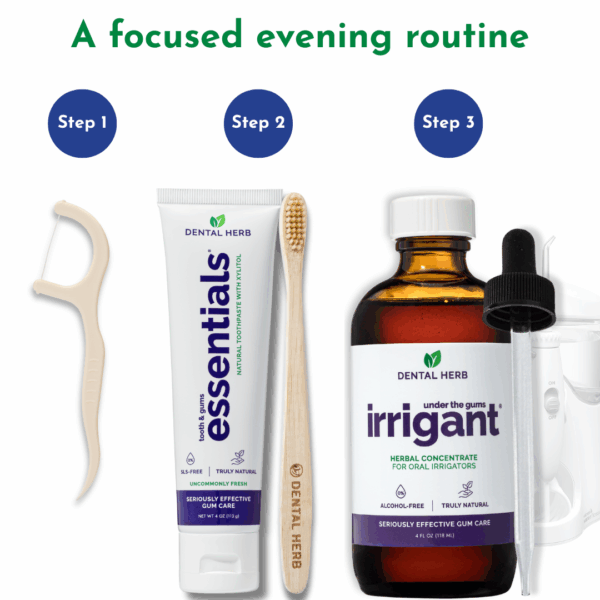 • Under the Gums Irrigant (Oral Irrigator Solution) – A professional-strength oral solution designed for dilution and use in oral irrigators as part of your daily routine.